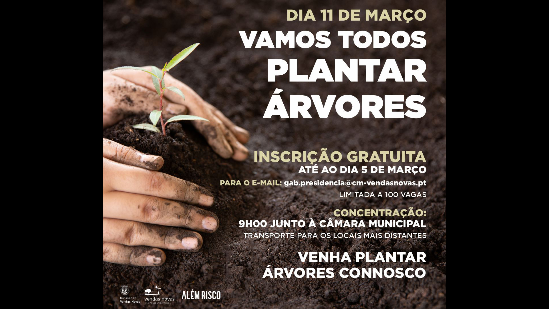No âmbito do projeto “Além Risco”, o Município irá organizar no próximo dia 11 de março, uma ação de TEAM BUILDING, ou seja, uma ação de trabalho de equipa, convidando a população a PLANTAR ÁRVORES E ARBUSTOS em vários locais do Concelho, nomeadamente, no Parque Infantil da Afeiteira, Foro Perdido (Afeiteira), Escola Secundária, Bairro José Saramago, Jardim Público e Landeira.