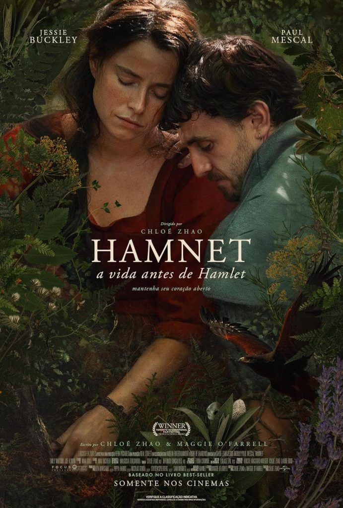 Vencedor do Globo de Ouro de Melhor Filme de Drama, e de Melhor Atriz para Jessie Buckley, “Hamnet” conta-nos a história de Agnes – a esposa de William Shakespeare – enquanto ela luta para lidar com a perda de seu único filho, Hamnet. Uma história humana e comovente que serve de pano de fundo para a criação da peça mais famosa de Shakespeare.