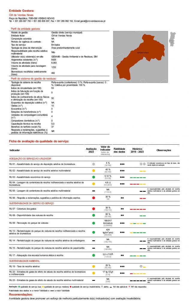 O município de Vendas Novas é a entidade gestora responsável pelo serviço de resíduos urbanos “em baixa”. A qualidade de gestão deste serviço é avaliada anualmente pela ERSAR (Entidade Reguladora dos Serviços de Águas e Resíduos). O último ciclo de avaliação completo encontra-se disponível na figura seguinte: