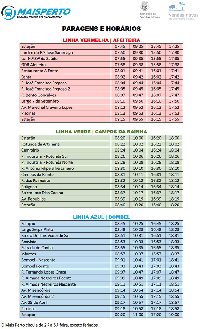 Os horários encontram-se disponíveis neste folheto, nas diversas paragens espalhadas pela cidade e poderão ser consultados na página institucional do Município de Vendas Novas, bem como na sua página de Facebook.